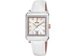 Mit einem silbernen Edelstahlgehäuse und einem zarten rosa Lederarmband strahlt diese Uhr sowohl Robustheit als auch Feminität aus. Das rosa Zifferblatt verleiht der Uhr einen Hauch von Verspieltheit und ist leicht ablesbar.